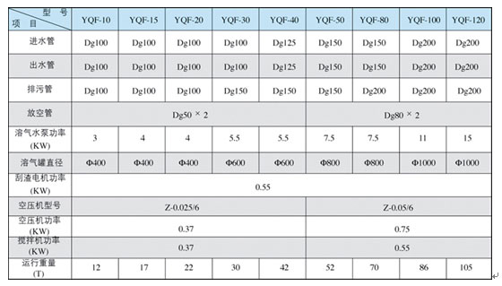 注:溶氣水回流比按30%設(shè)計(jì);水力表面負(fù)荷:3~6m3/m2˙h;停留時(shí)間:15~30min。